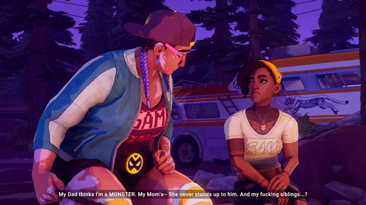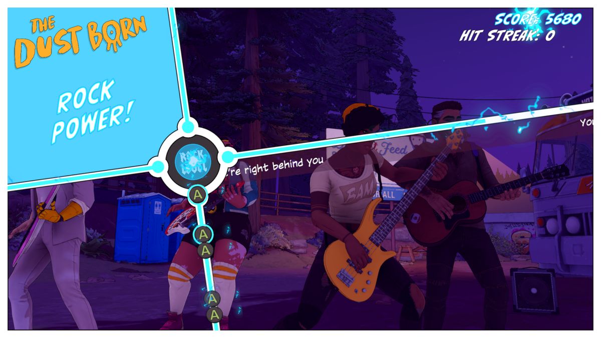 Dustborn er et slags Life is Strange 2 møter Sunset Overdrive, for de som tar den referansen. Det vil si at du i beste Den Lengste Reisen-stil må snakke med folk for å komme deg videre, men at du også plutselig må knuse trynet på slemminger og bosser med balltrær og superkrefter, før du spiller et Guitar Hero-aktig rytmespill for å overbevise en grensevakt om at du faktisk KAN spille bass. Du spiller som Pax, en lovløs “anomal”, som har evner. Kall henne gjerne en x-woman. Ved hjelp av ordets makt, bokstavelig talt, kan du på magisk vis manipulere menneskene rundt deg til å vende seg mot andre, dytte dem fysisk unna eller få dem til å tie stille - for å nevne noe.