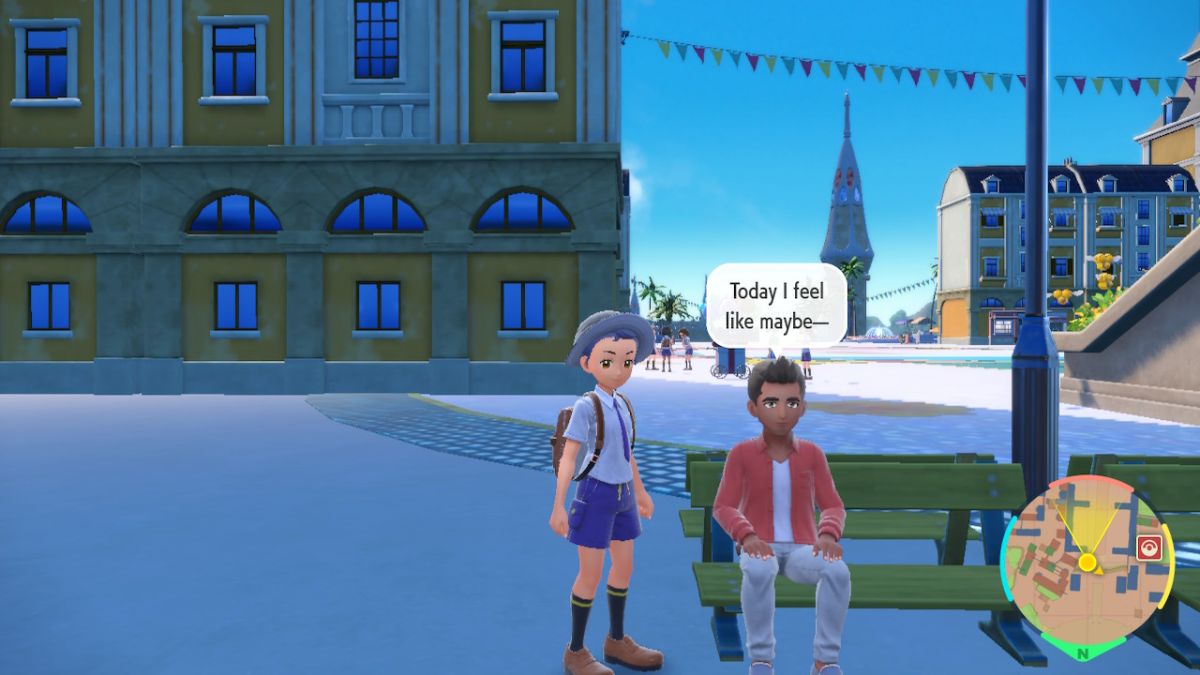 Innholdsmessig er spillet også et steg tilbake fra Legends: Arceus, for der variasjonen mellom lytting og lek i all hovedsak var godt balansert og fungerte bra i Arceus, respekterer rett og slett ikke Violet spillerens tid. Historiedelene er overfylt av en hel haug med repeterende cutscenes, anmasende og til tider svært svak dialog og fryktelig timing på hvordan replikker og reaksjoner leveres. Fordi dialogen til tider får meg til å rødme med linjer som "If you don’t clear out real quick-like, I’ll hafta, (ja - h a f t a,) come at you in self-defense. You get me?" blir noen av sekvensene i spillet en buttonmashing for å komme seg videre. Jeg er glad i tekstbaserte spill og har noen av mine sterkeste spillopplevelser med Disco Elysium, Citizen Sleeper og Pentiment, men å sammenlikne disse manusene med manusene i Pokémon Violet er en hån mot tekstforfatteryrket. Game Freak kunne halvert antallet tekstlinjer i Pokémon Violet - og automatisk laget et langt bedre spill.