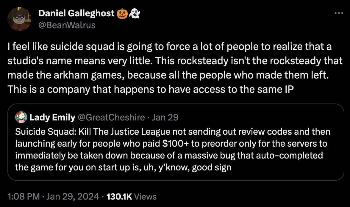 Med andre ord: Når Rocksteady annonserte sitt nye spill som hadde den helt rå tittelen «Suicide Squad: Kill the Justice league» var jeg milf smakt UMIDDELBART solgt! Men. Årene gikk, spillet ble utsatt en hel haug med ganger og etter hvert når ord som live service, battle pass, always online og EMOTES ble brukt for å beskrive dette spillet ble jeg ganske nervøs. Men...dette er jo Rocksteady! Folka bak kanskje min favorittspillserie noensinne! Så, selv om dette var et live service skytespill (som er en sjanger jeg ALDRI har rørt før), så måtte jeg jo ha litt tro på dem!