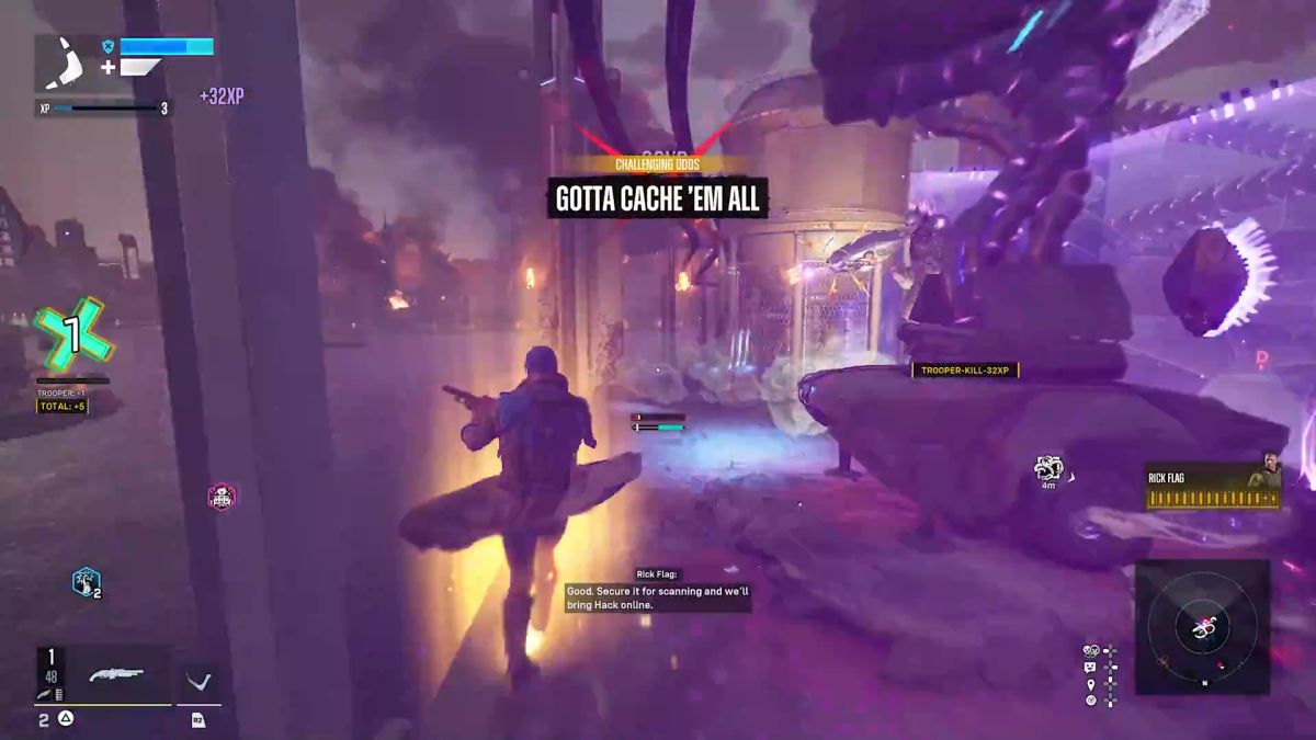 3: Før du vet ordet av det er spillet plutselig ferdig, og da blir du kastet inn igjen i spillet med et løfte om «skikkelig kult» post game-content med nye karakterer du kan spille som og andre oppdrag. Problemet er at alt fortsatt utelukkende består av å skyte lilla romvesener til evig tid. DETTE. ER. SPILLET. Hovedhistorien og karakterene som er i Suicide Squad er så utrolig umotivert satt sammen. Det er rett og slett veldig tydelig at dette har vært nedprioritert av Rocksteady, og at de vil du skal skyte lilla romvesener i mange år framover.