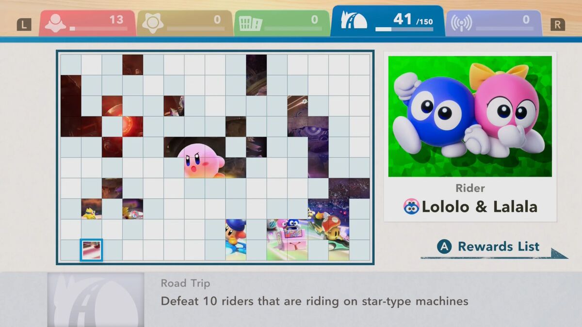Denne modusen er skikkelig gøy, og innbyr til gjenspillbarhet fordi det faktisk er flere ulike veivalg å ta underveis. Det er 12 ulike verdener her, og det er ikke mulig å utforske alle på et run, så her er det mange timer spilletid for enspilleren. Jeg liker Road Trip skikkelig godt, og syns modusen er det aller beste med Kirby Air Riders når jeg spiller alene.